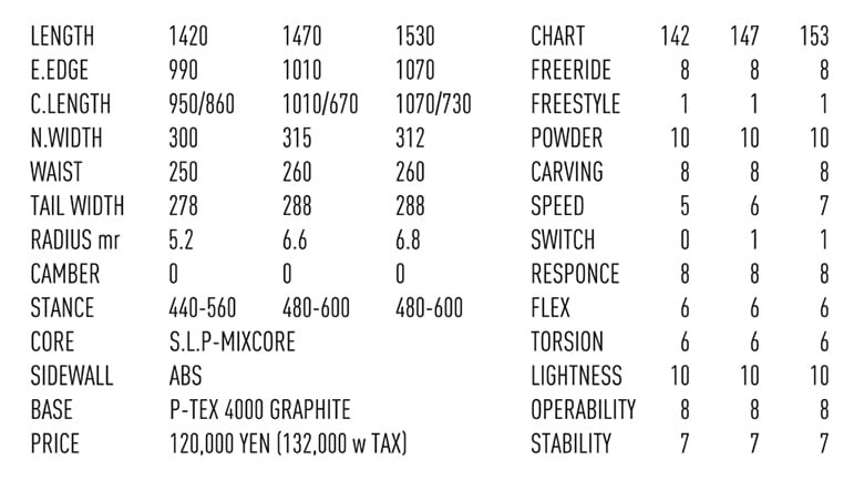 スクエア形状とアーリーライズロッカーを組合せたノーズはパウダーでの絶大な浮力と取り回しを確保し、ウィングの入ったシーラテイルはターン後半の粘りと快適な抜けを両立。キャンバーはパウダーライディングにも抵抗になりにくく、尚且つカービング時にしっかりとグリップし、フリースタイラーのライディングスタイルにも応える4mmキャンバーに設定しました。ゲレンデでのシャープなカービングからキッカー、ナチュラルヒットからウォールライディング、ビッグバーンでのパウダーライディングまで全てを網羅するマウンテンフリースタイルボードの誕生です。