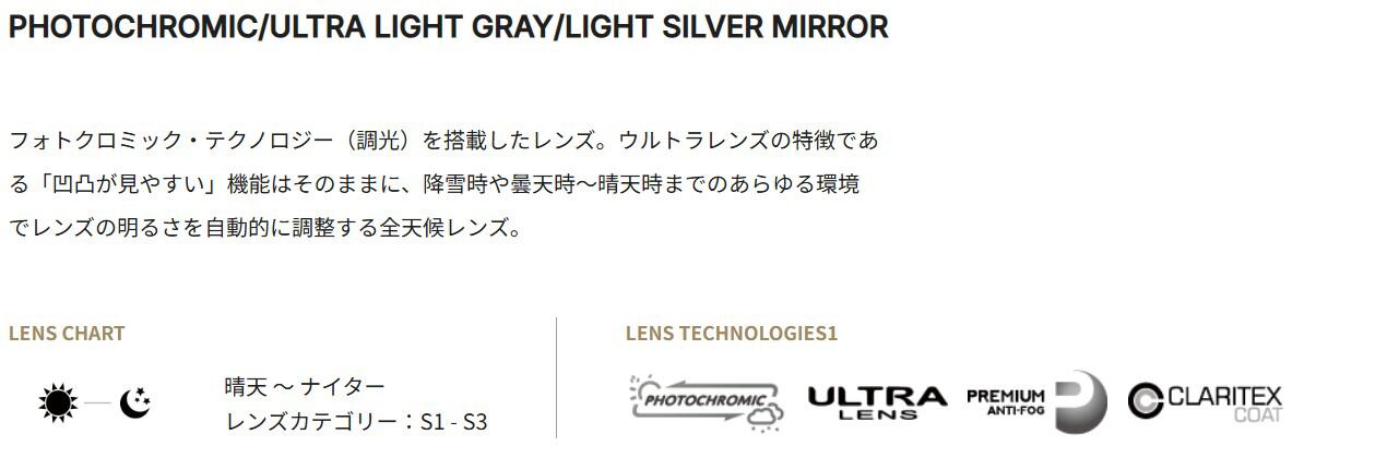 フォトクロミック・テクノロジー(調光)を搭載したレンズ。ウルトラレンズの特徴である「凹凸が見やすい」機能はそのままに、降雪時や曇天時~晴天時までのあらゆる環境でレンズの明るさを自動的に調整する全天候レンズ。