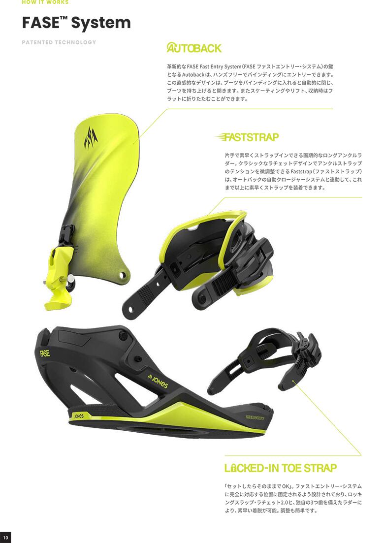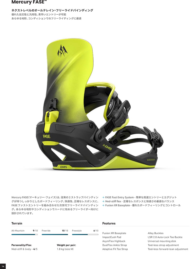 Mercury FASE(マーキュリー・フェイス)は、従来の2ストラップバインディングが持つしっかりとしたボードフィーリング、快適性、正確なレスポンスに、FASE ファストエントリーを組み合わせた次世代フリーライドバインディング。あらゆる地形やコンディションでハードに攻めるフリーライダー向けに設計されています。